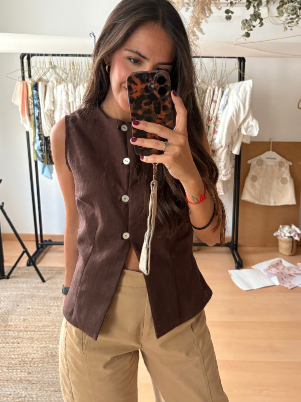 El chaleco Akila forma parte de nuestra colección cápsula de lino, una serie de prendas hechas a mano en nuestro taller de Sevilla que celebran la sencillez, la textura y el verano eterno.