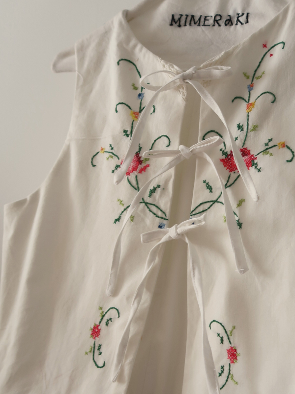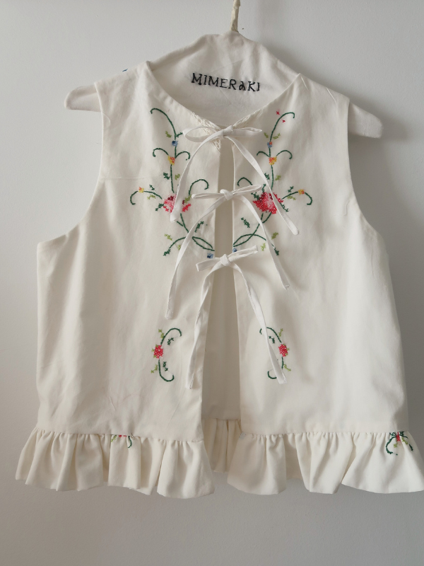 Pieza única confeccionada a mano en nuestro estudio utilizando tejidos vintage rescatados: antiguos manteles, sábanas bordadas y textiles con historia. Este diseño forma parte de nuestra colección de moda upcycling, donde transformamos materiales olvidados en prendas exclusivas, llenas de alma y carácter.