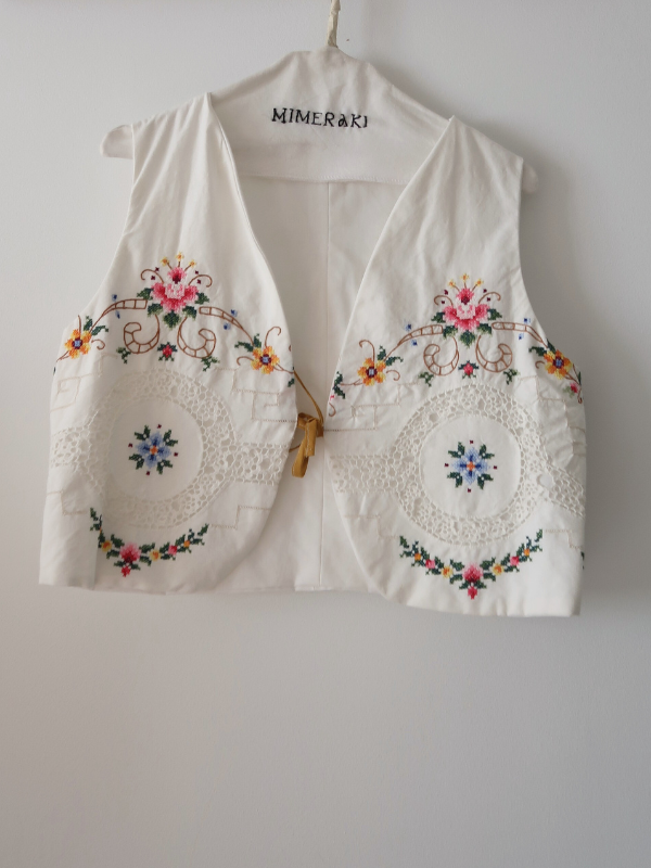 Pieza única confeccionada a mano en nuestro estudio utilizando tejidos vintage rescatados: antiguos manteles, sábanas bordadas y textiles con historia. Este diseño forma parte de nuestra colección de moda upcycling, donde transformamos materiales olvidados en prendas exclusivas, llenas de alma y carácter.