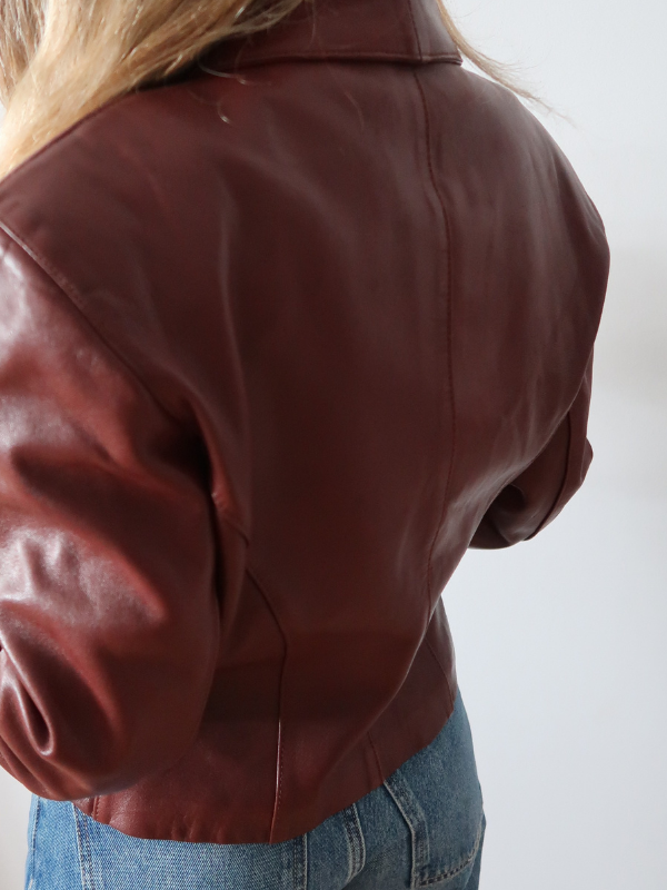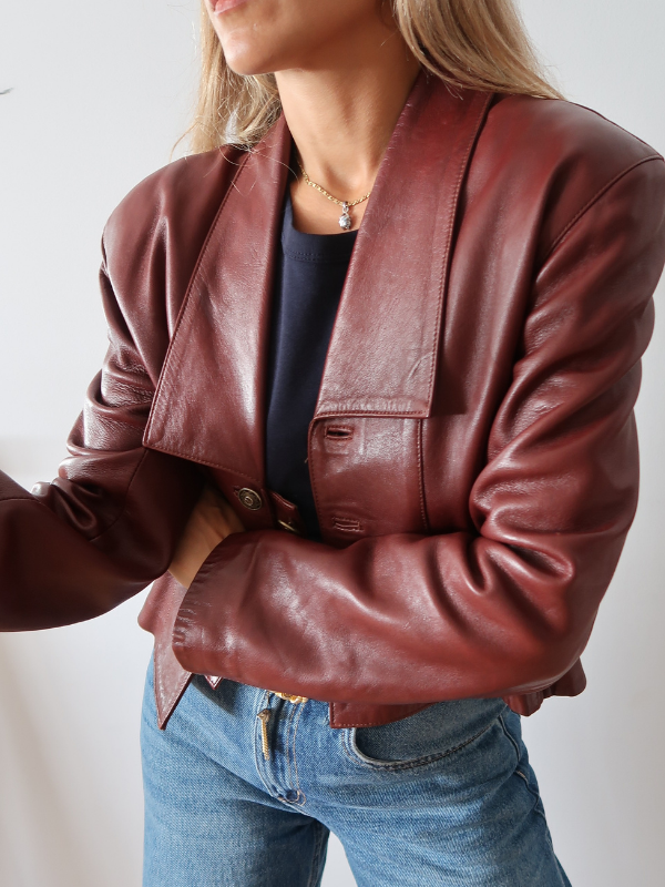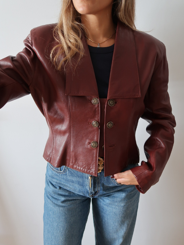 Chaqueta vintage austriaca de piel 100 % auténtica, en un elegante tono burdeos profundo que resalta su carácter y exclusividad. Su corte estructurado, ligeramente cropped, y los botones metálicos decorativos le aportan ese aire sofisticado y atemporal tan típico de las piezas centroeuropeas de los años 80.