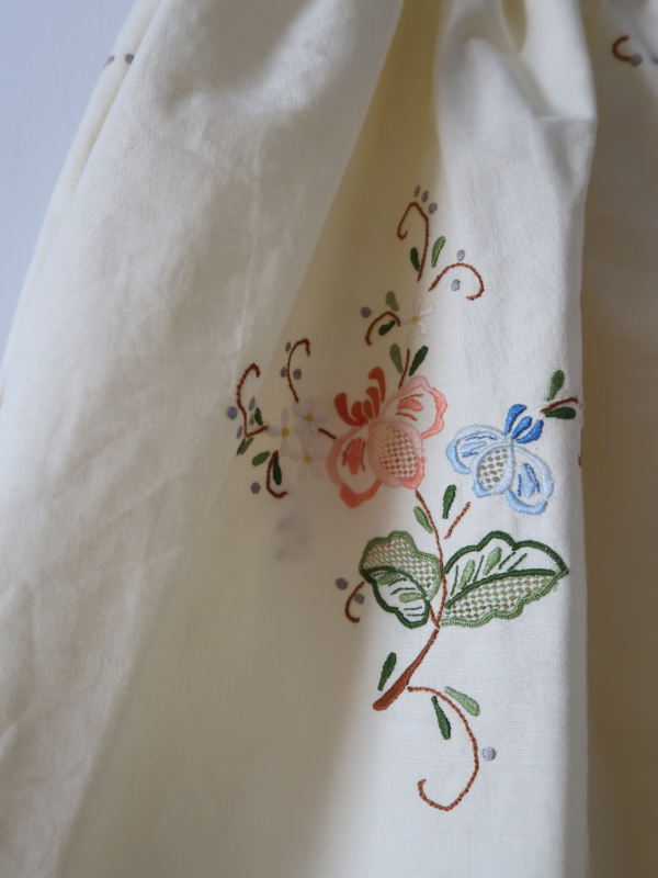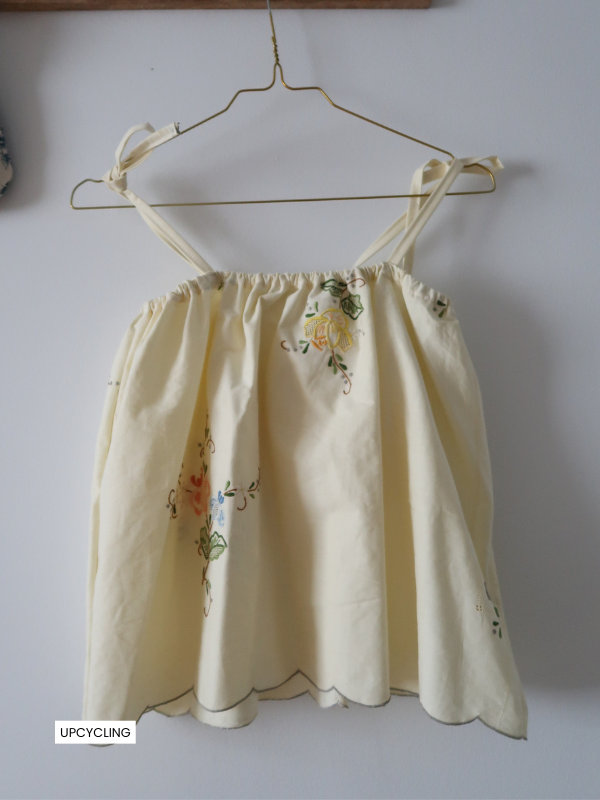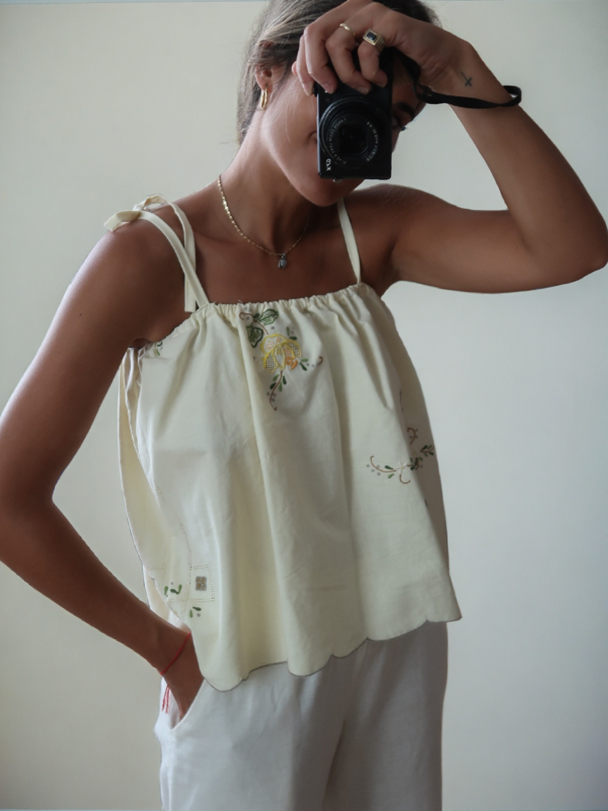 Pieza única confeccionada a mano en nuestro estudio utilizando tejidos vintage rescatados: antiguos manteles, sábanas bordadas y textiles con historia. Este diseño forma parte de nuestra colección de moda upcycling, donde transformamos materiales olvidados en prendas exclusivas, llenas de alma y carácter.