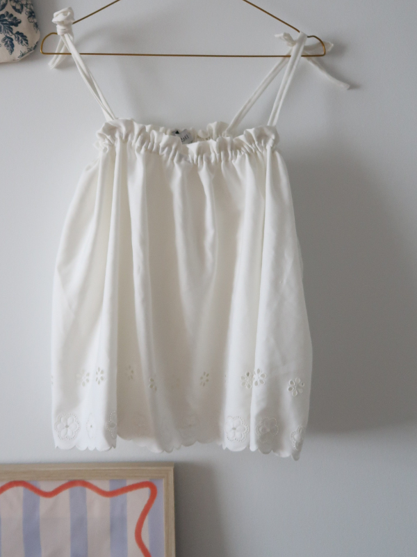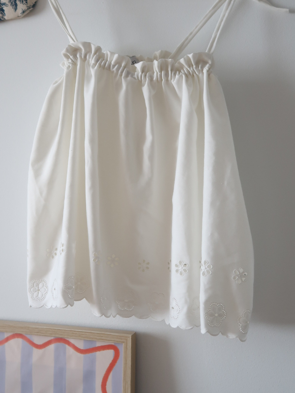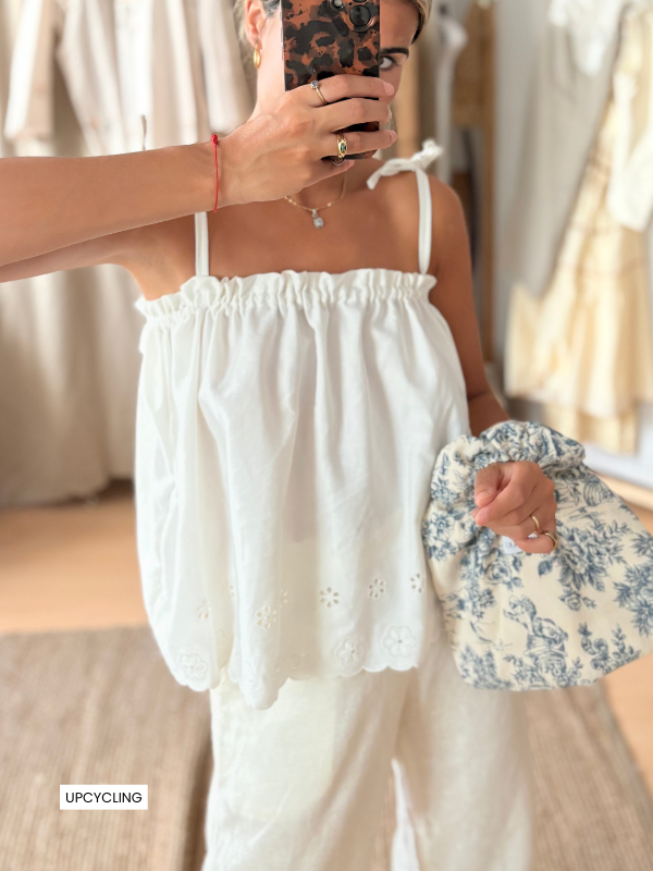Pieza única confeccionada a mano en nuestro estudio utilizando tejidos vintage rescatados: antiguos manteles, sábanas bordadas y textiles con historia. Este diseño forma parte de nuestra colección de moda upcycling, donde transformamos materiales olvidados en prendas exclusivas, llenas de alma y carácter.