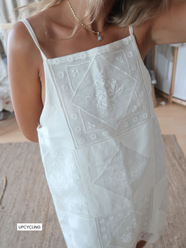 Vestido capa upcycling hecho a partir de un mantel vintage.