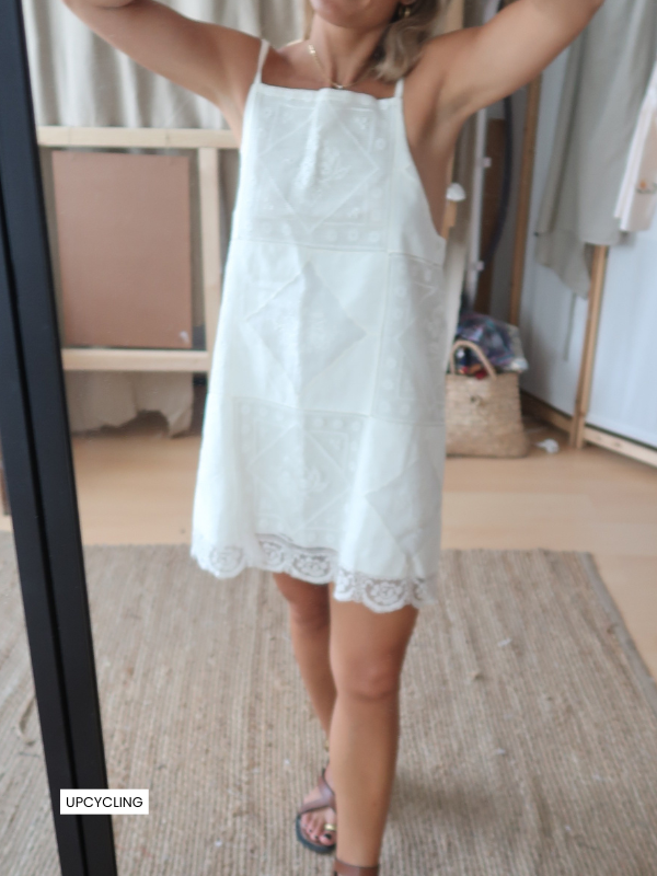 Pieza única confeccionada a mano en nuestro estudio utilizando tejidos vintage rescatados: antiguos manteles, sábanas bordadas y textiles con historia. Este diseño forma parte de nuestra colección de moda upcycling, donde transformamos materiales olvidados en prendas exclusivas, llenas de alma y carácter.
