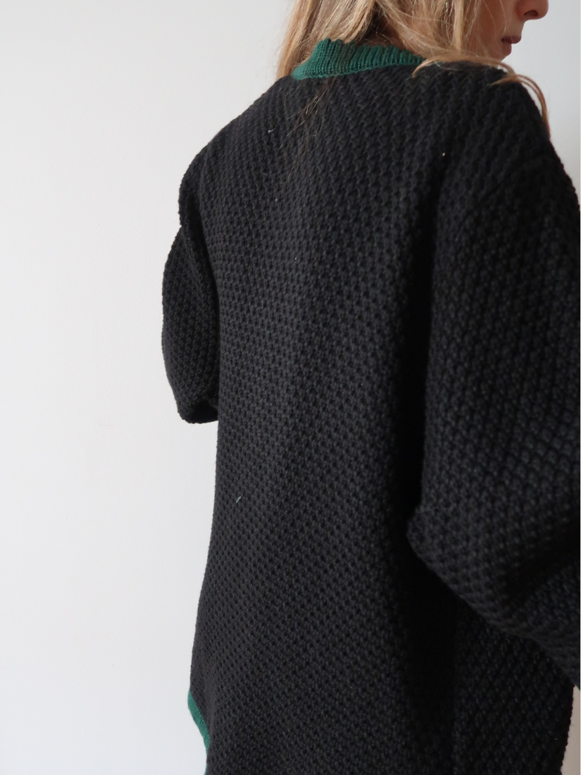 Una joya vintage en punto grueso negro con vivos verdes, confeccionada en lana virgen. Su textura densa y sus botones metálicos grabados evocan las prendas tradicionales del Tirol, reinterpretadas en una versión moderna y urbana.